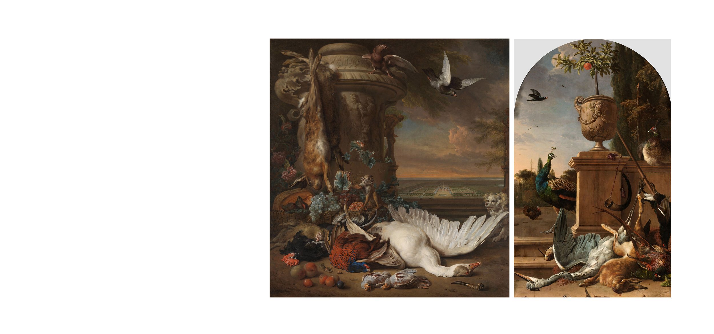 Especially in two paintings created by Jan Weenix and Melchior d'Hondecoeter (The well-known artists of the 18th century and 17th century respectively), this paradoxical combination reaches a high point. The admirable pieces of art in which the controversy between a brutal scene and aesthetical pleasure leads us to contemplate deeply. It can be said that both contain two horizontal layers which represent totally different scenes. In the lower sectors, brutally hunted animals are stacked and combined with each other, and upper layers are noticeably alive picturing very dynamic sceneries with live animals and even birds flying in the sky.
