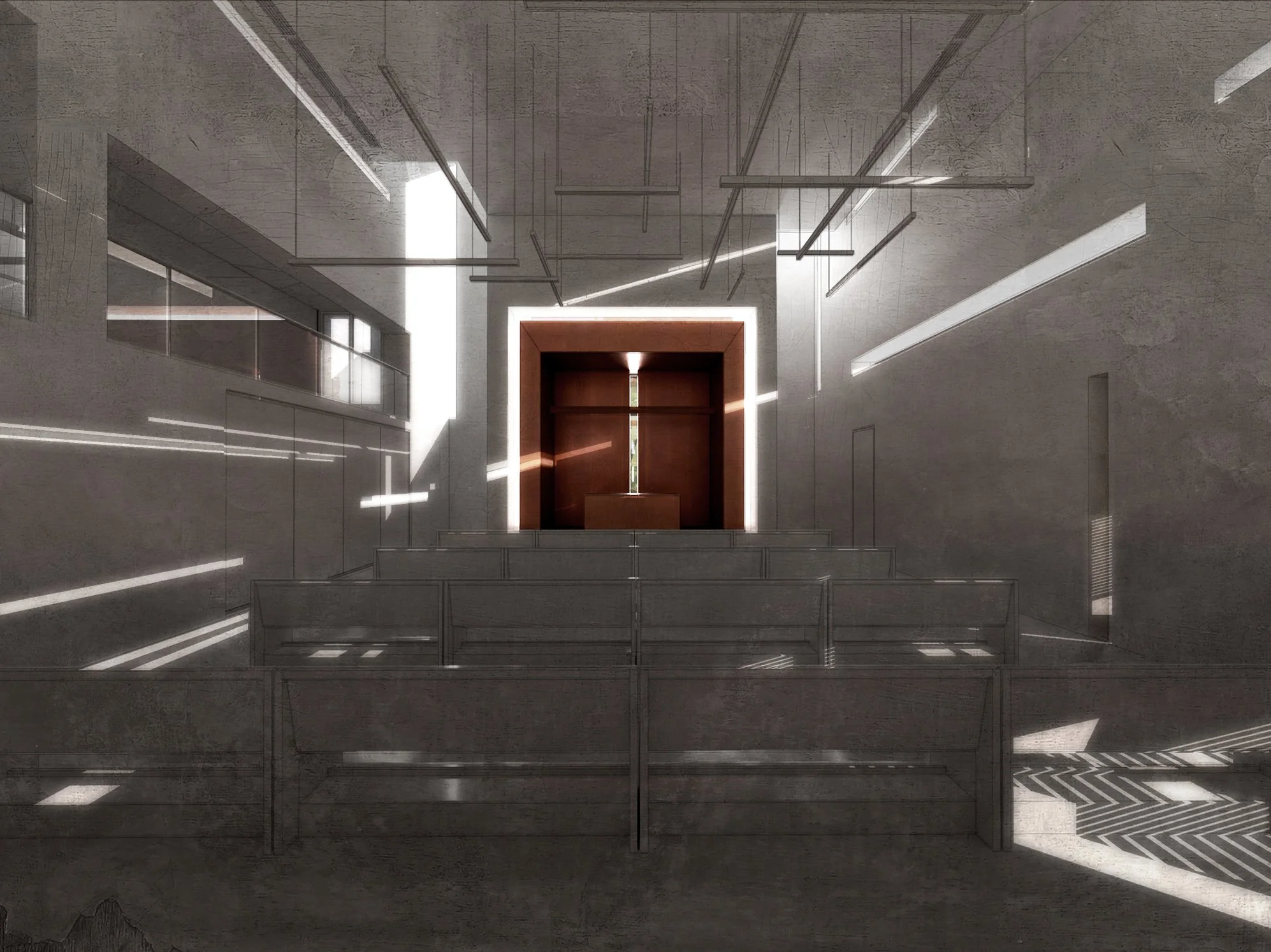 Light effect: Contemporary Lutheran architecture does not make use of paintings or sculptures, rather decoration is created by the materiality of surrounding surfaces themselves. The patterns, texture, and detailing give the impression of individuality in handcrafted ornamentation. Walls treated the same way on both faces establish a calm, elegant feeling, that corresponds to the Lutheran tradition.